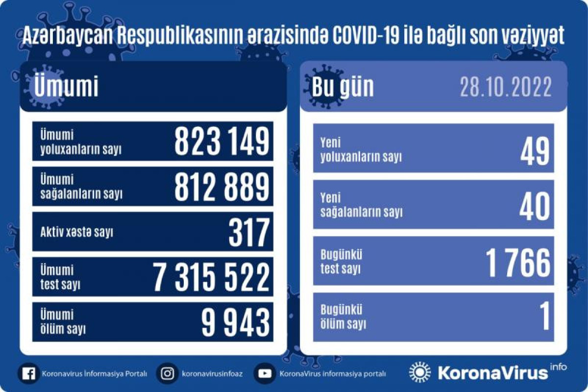 Azərbaycan Respublikasında koronavirus (COVID-19) infeksiyasına 49 yeni yoluxma faktı qeydə alınıb, 40 nəfər müalicə olunaraq sağalıb.