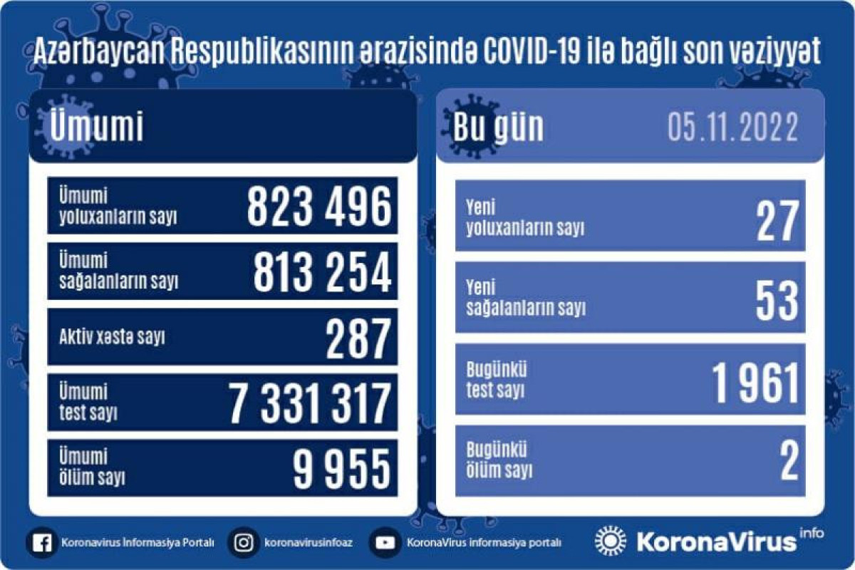 Azərbaycan Respublikasında koronavirus (COVID-19) infeksiyasına 27 yeni yoluxma faktı qeydə alınıb, 53 nəfər müalicə olunaraq sağalıb.