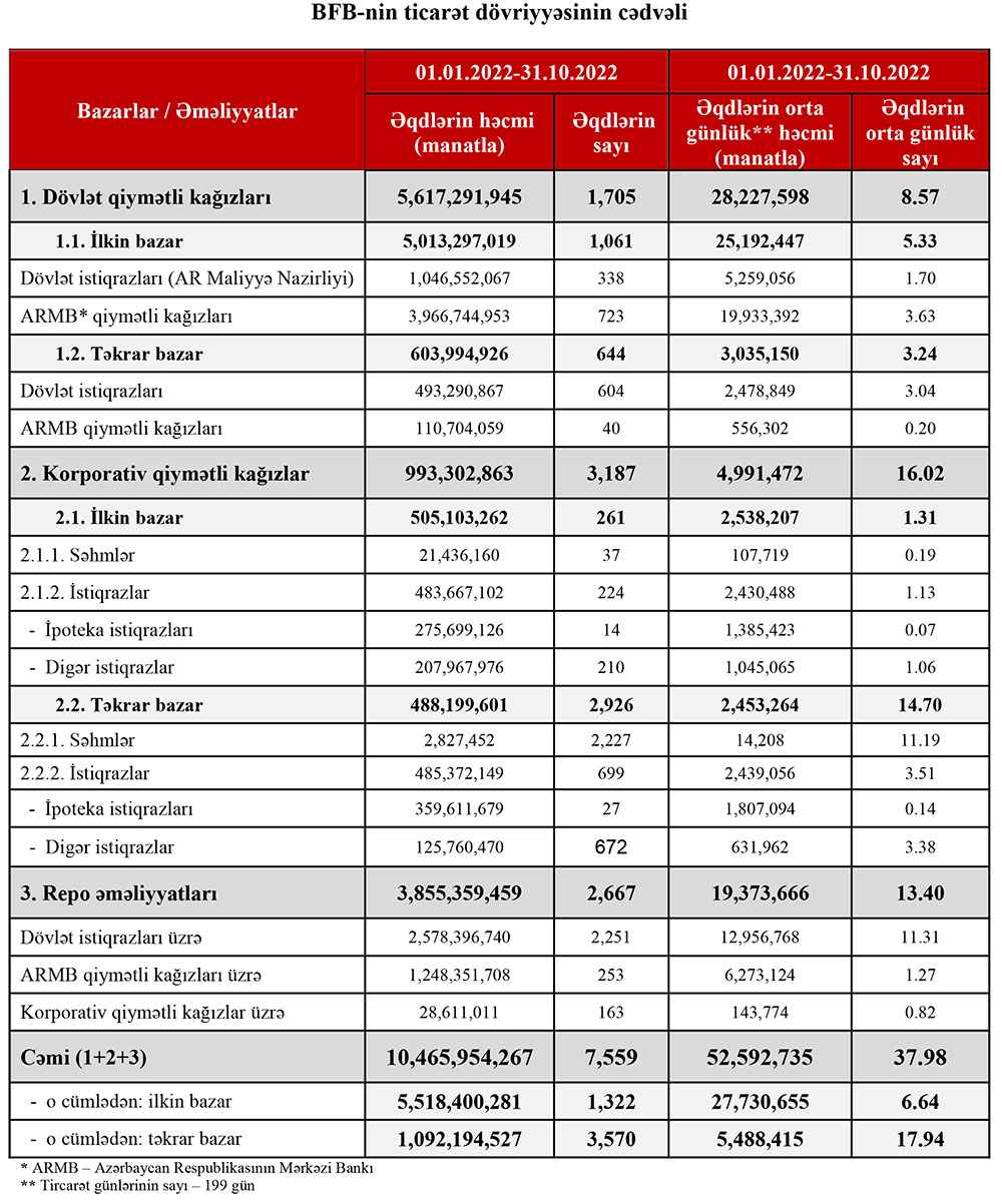 2022-ci ilin 10 ayı ərzində Bakı Fond Birjasında qiymətli kağızlar üzrə keçirilən əməliyyatların ümumi həcmi 10 milyard 465 miylon 954 min manat təşkil edib.