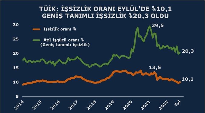TÜİK-in məlumatına görə, yaşı 15 və daha yuxarı olan işsizlərin sayı sentyabr ayında əvvəlki ayla müqayisədə 120 min nəfər artaraq 3 milyon 482 min nəfərə çatıb.
