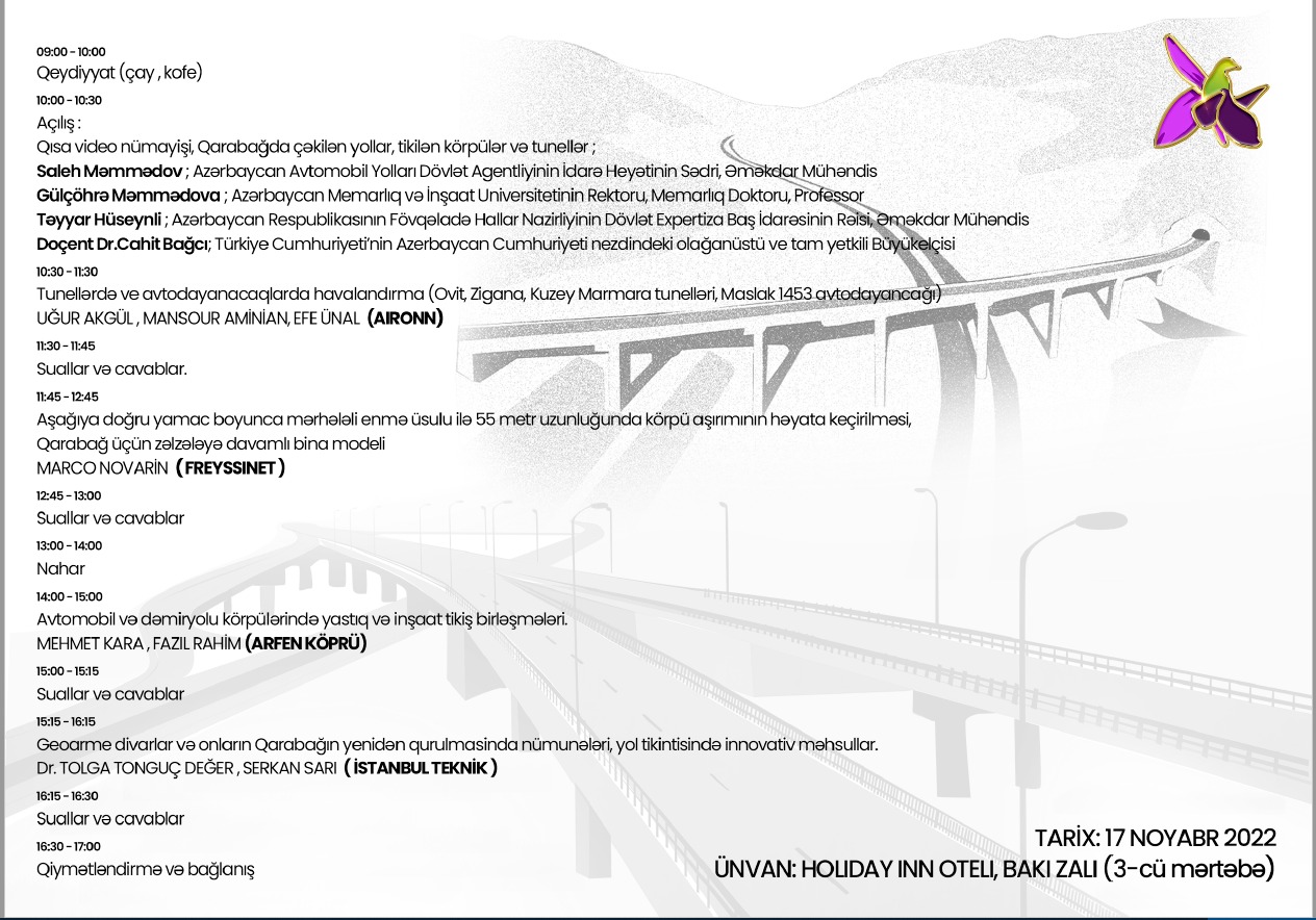 Konfransda "Aironn" şirkətindən Uğur Akgül və Efe Ünal "Tunellərdə və avtodayanacaqlarda havalandırma", "Freysinnet" şirkətindən Marco Novarin "Aşağıya doğru yamac boyunca mərhələli enmə üsulu ili 55 metr uzunluğunda körpü aşrımının həyata keçirilməsi, Qarabağ üçün zəlzələyə davaml bina modeli", "Arfen Körpü" şirkətindən Mehmet Kara və Fazıl Rahim "Avtomobil və dəmiryolu körpülərində yastıq və inşaat tikiş birləşmələri", "İstanbul Teknik"dən Tolga Tonguç Değer və Serkan Sarı "Geoarme divarlar və onların Qarabağın yenidən qurulmasında nümunələri, yol tikintisində innovativ məhsullar" mövzularında çıxış edəcəklər.