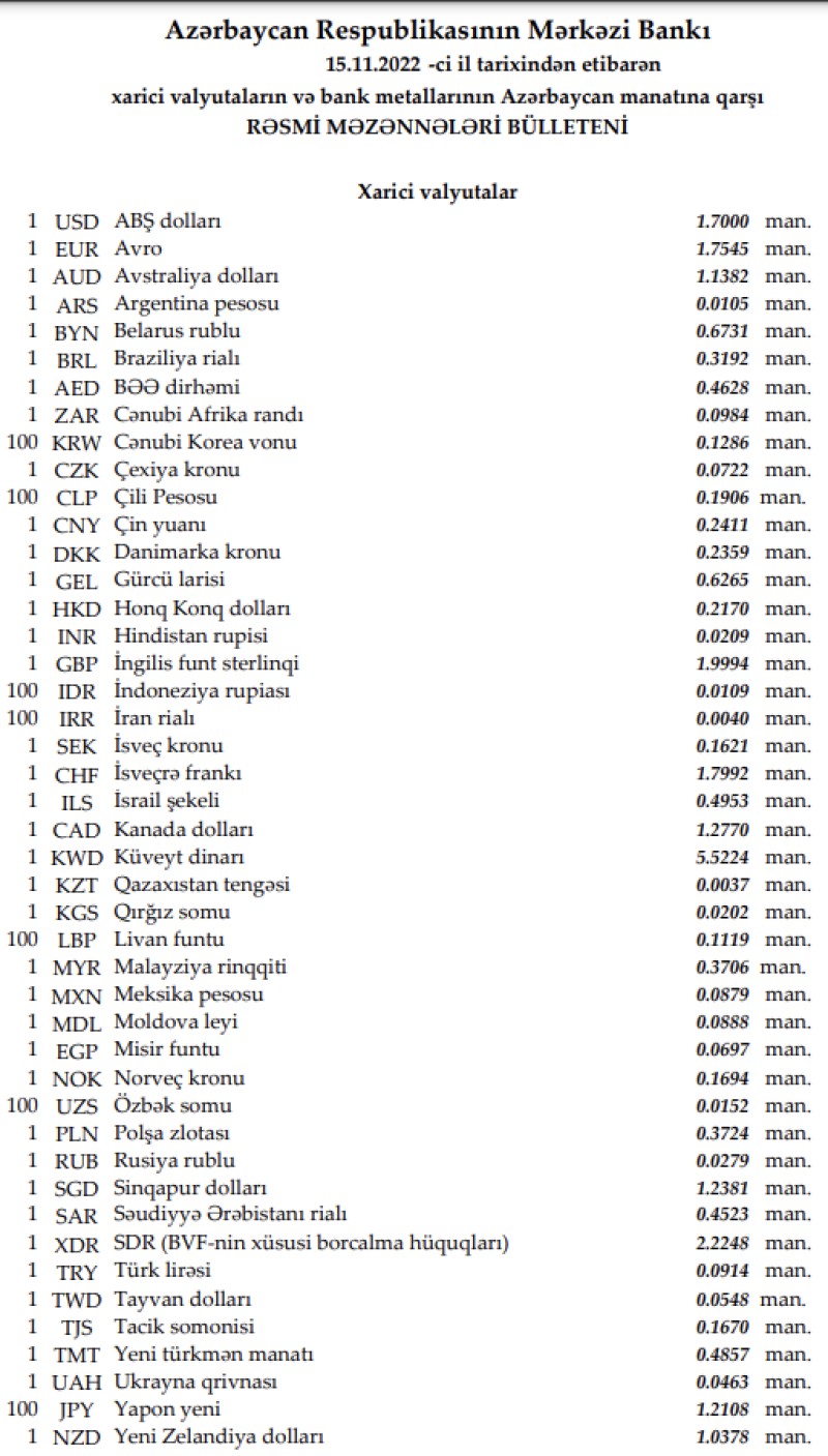 Dolların bazar ertəsi üçün rəsmi məzənnəsi müəyyən olunub