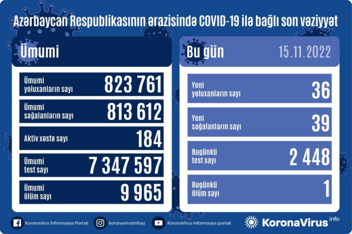 Azərbaycan Respublikasında koronavirus (COVID-19) infeksiyasına 36 yeni yoluxma faktı qeydə alınıb, 39 nəfər müalicə olunaraq sağalıb.