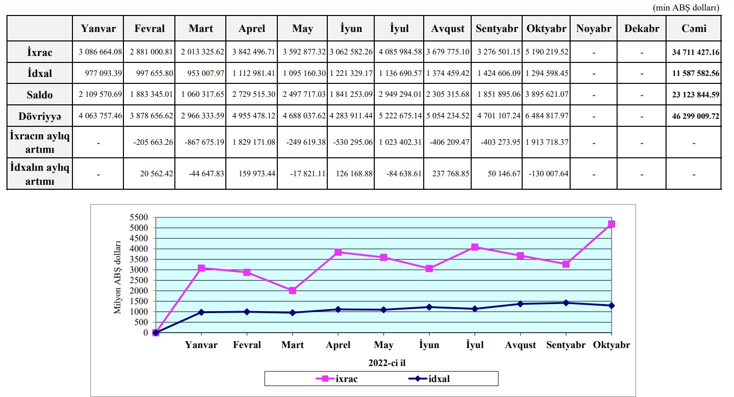 2022-ci ilin 10 ayında (yanvar-oktyabr) Azərbaycanın xarici ticarət əməliyyatlarının həcmi 46 milyard 299 milyon 10 min ABŞ dolları təşkil edib.