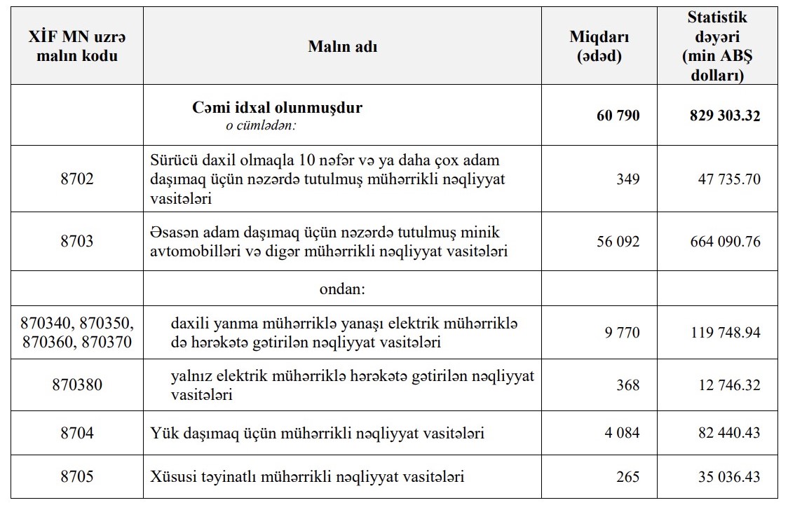 2022-ci ilin 10 ayı ərzində (yanvar-oktyabr) Azərbaycana 829 milyon 303 min dollar dəyərində 60 min 790 ədəd nəqliyyat vasitəsi idxal edilib.