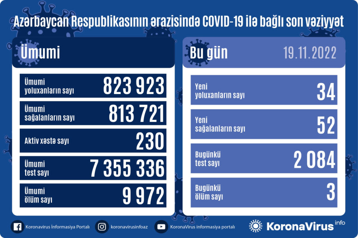 Azərbaycanda koronavirus (COVID-19) infeksiyasına 34 yeni yoluxma faktı qeydə alınıb, 52 nəfər müalicə olunaraq sağalıb.