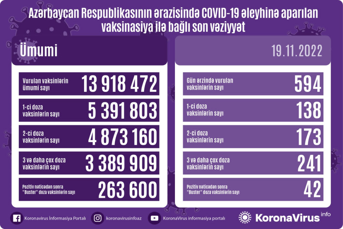 Azərbaycanda son sutkada koronavirus (COVID-19) əleyhinə 594 vaksin vurulub. Bir gündə birinci mərhələ üzrə vaksinasiya olunanların sayı 138, ikinci mərhələ üzrə vaksinasiya olunanların sayı 173, üç və daha çox doza üzrə vaksinasiya olunanların sayı 241, pozitiv nəticədən sonra buster doza üzrə vaksinasiya olunanların sayı 42 nəfərdir.