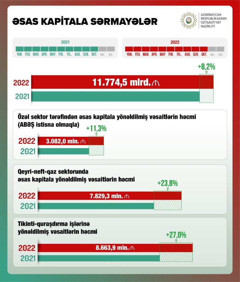 Bu ilin yanvar-oktyabr aylarında əsas kapitala yönəldilmiş vəsaitlər əvvəlki ilin müvafiq dövrünə nisbətən 8,2% artaraq 11 milyard 774,5 milyon manat olub.
