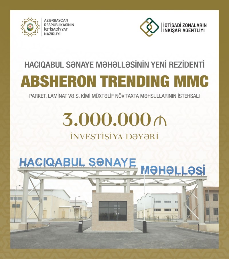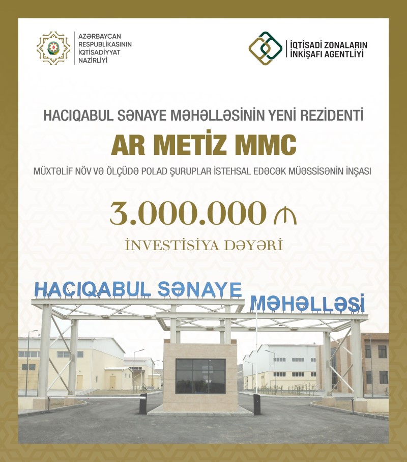 Hacıqabul Sənaye Məhəlləsində 3 yeni sahibkarlıq subyektinə rezident statusu verilib və rezidentlərin sayı 13-ə çatıb.