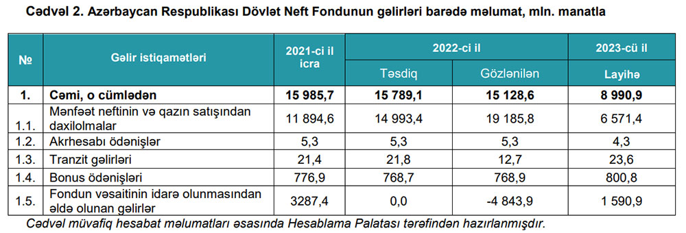 Marja.az xəbər verir ki, bu barədə Azərbaycan Respublikası Hesablama Palatasının Azərbaycan Respublikası Dövlət Neft Fondunun 2023-cü il büdcəsinin layihəsinə Rəyində bildirilir.