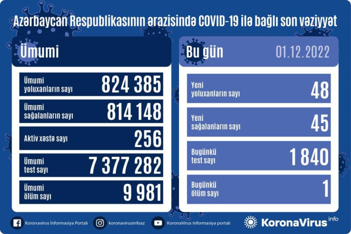 Azərbaycan Respublikasında koronavirus (COVID-19) infeksiyasına 48 yeni yoluxma faktı qeydə alınıb, 45 nəfər müalicə olunaraq sağalıb.