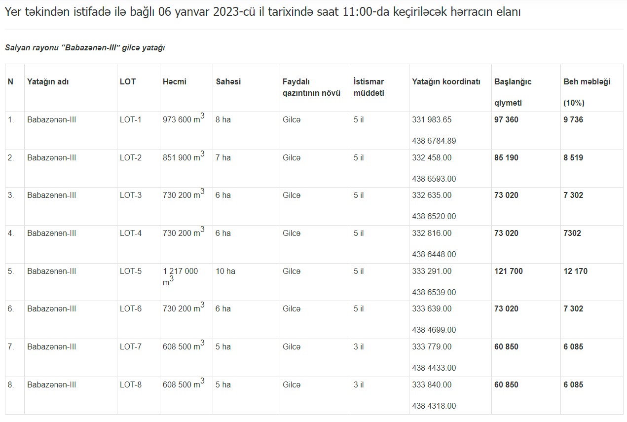 Dövlət Mineral Xammal Ehtiyatlarından İstifadə Agentliyinin yaydığı məlumatda bildirilir ki, hərracda 8 lot üzrə Salyan rayonu “Babazənən-III” gilcə yatağı satışa çıxarılacaq. Lotların başlanğıc qiymətləri 60 850 manat - 121 700 manat civarındadır.