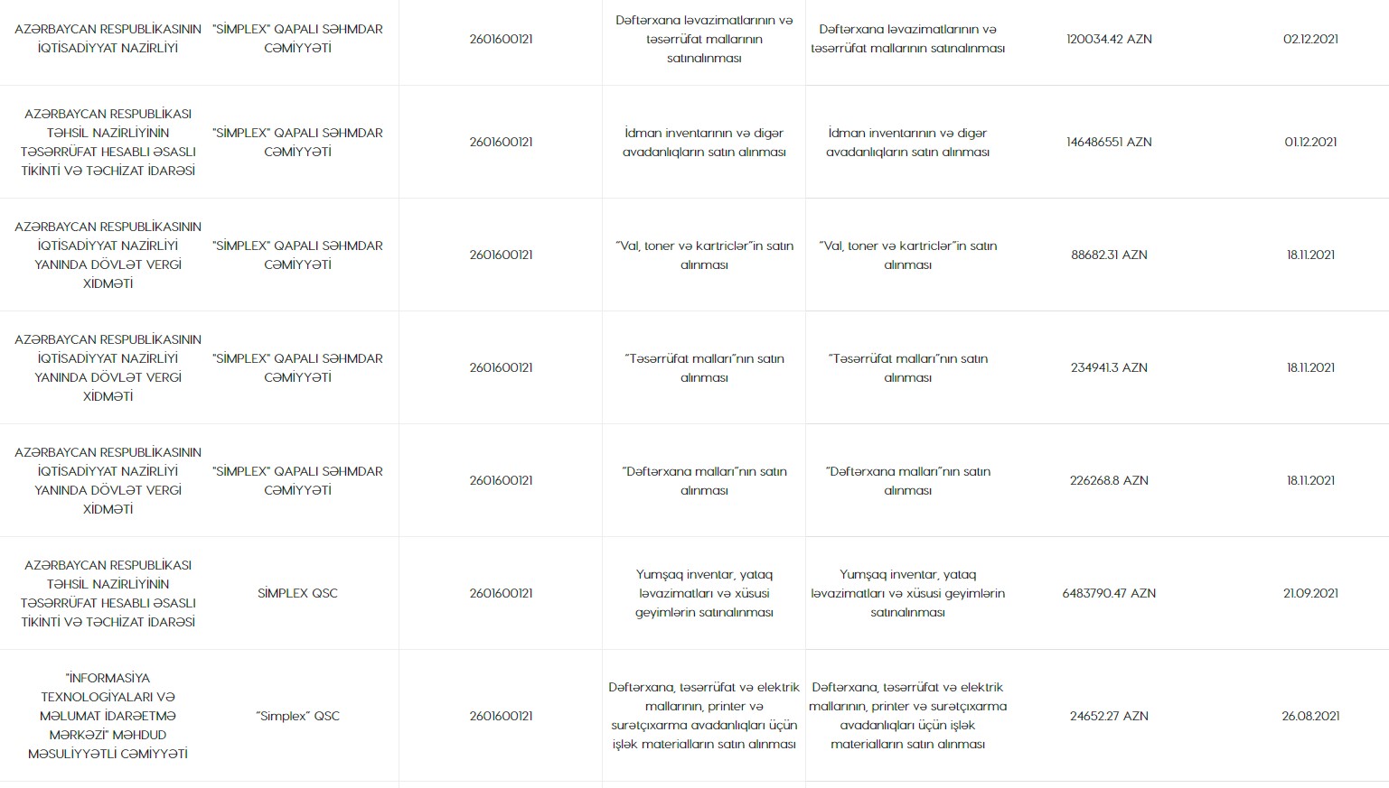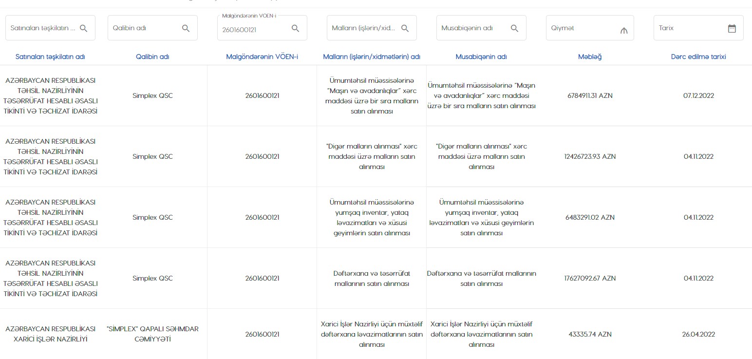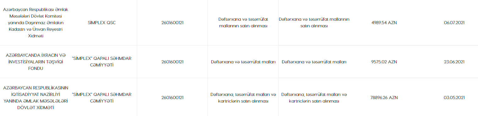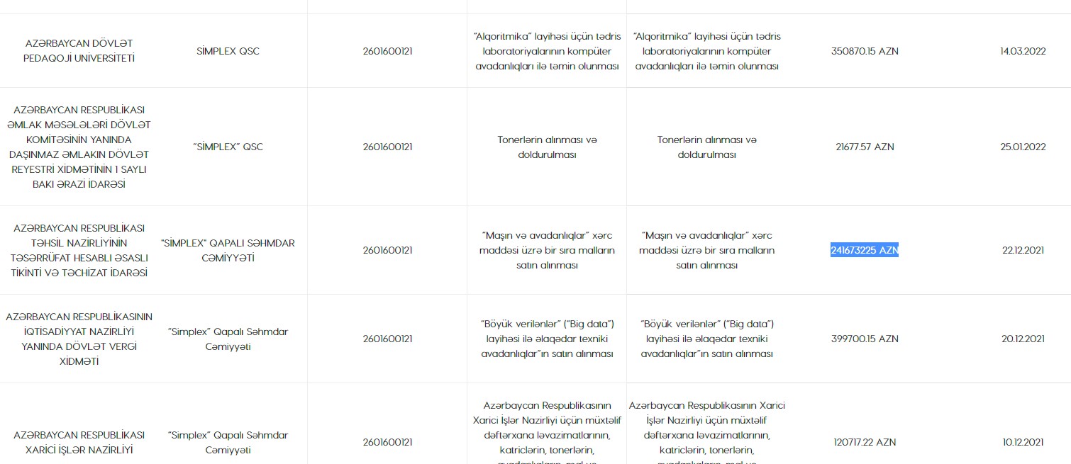 Satınalma portalında verilən məlumata görə, 2021-ci ildə "Simplex" QSC Elm və Təhsil Nazirliyindən “Maşın və avadanlıqlar” xərc maddəsi üzrə bir sıra malların satın alınmasıüzrə 241 milyon 673 min 225 manatlıq və "İdman inventarının və digər avadanlıqların satın alınması" üzrə 146 milyon 486 min 551 manatlıq sifarişlər də alıb. Qeyd edək ki, bu məbləğlər yanlış da ola bilər, çünki satınalma portalında müqavilə məbləğlərinin səhv daxil edilməsi halları tez-tez baş verir.