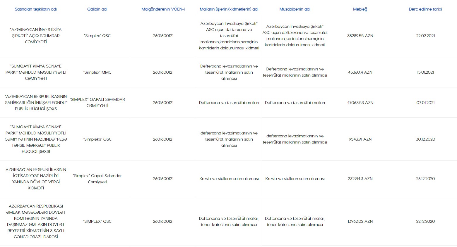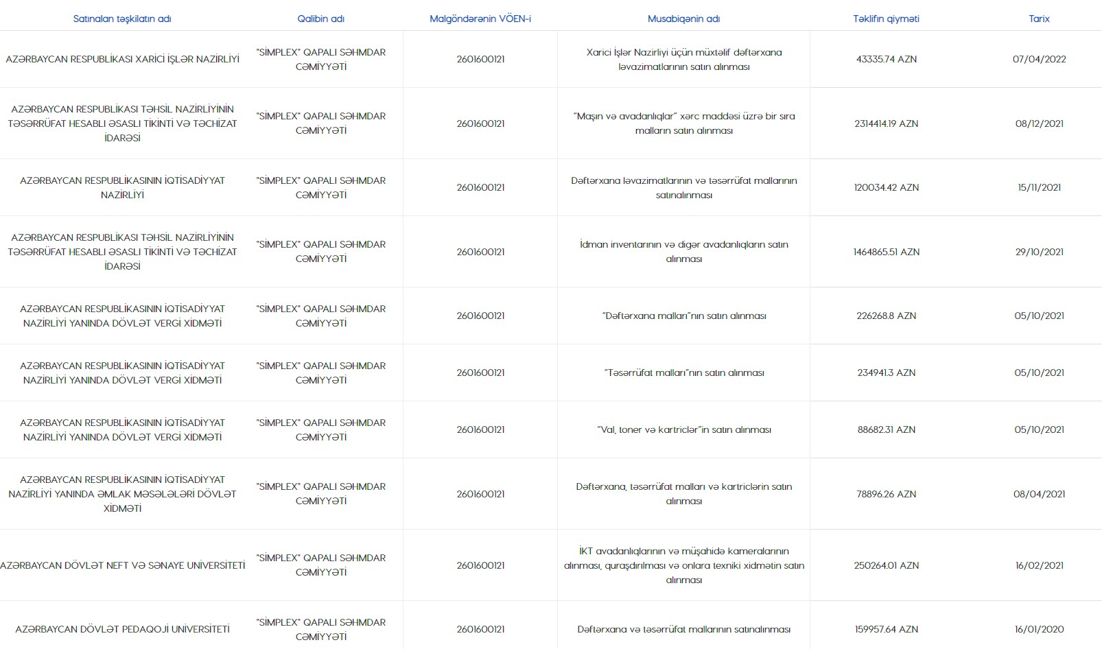 Marja.az xəbər verir ki, "Simplex" şirkəti 2022-ci ildə dövlət qurumları tərəfindən keçirilmiş tenderlərdə 8 dəfə qalib olub, o cümlədən, 4 dəfə Elm və Təhsil Nazirliyinin tenderlərində qalib elan edilib.