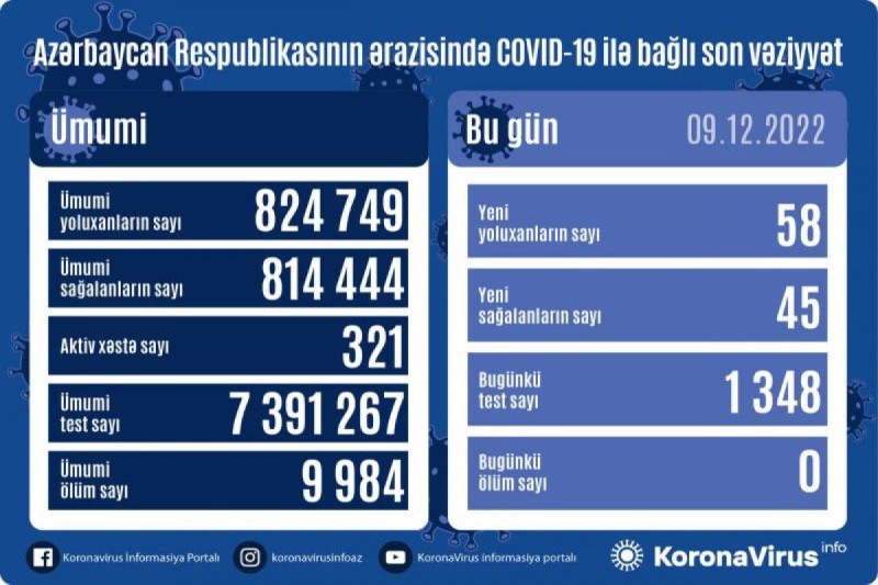 Azərbaycan Respublikasında koronavirus (COVID-19) infeksiyasına 58 yeni yoluxma faktı qeydə alınıb, 45 nəfər müalicə olunaraq sağalıb.