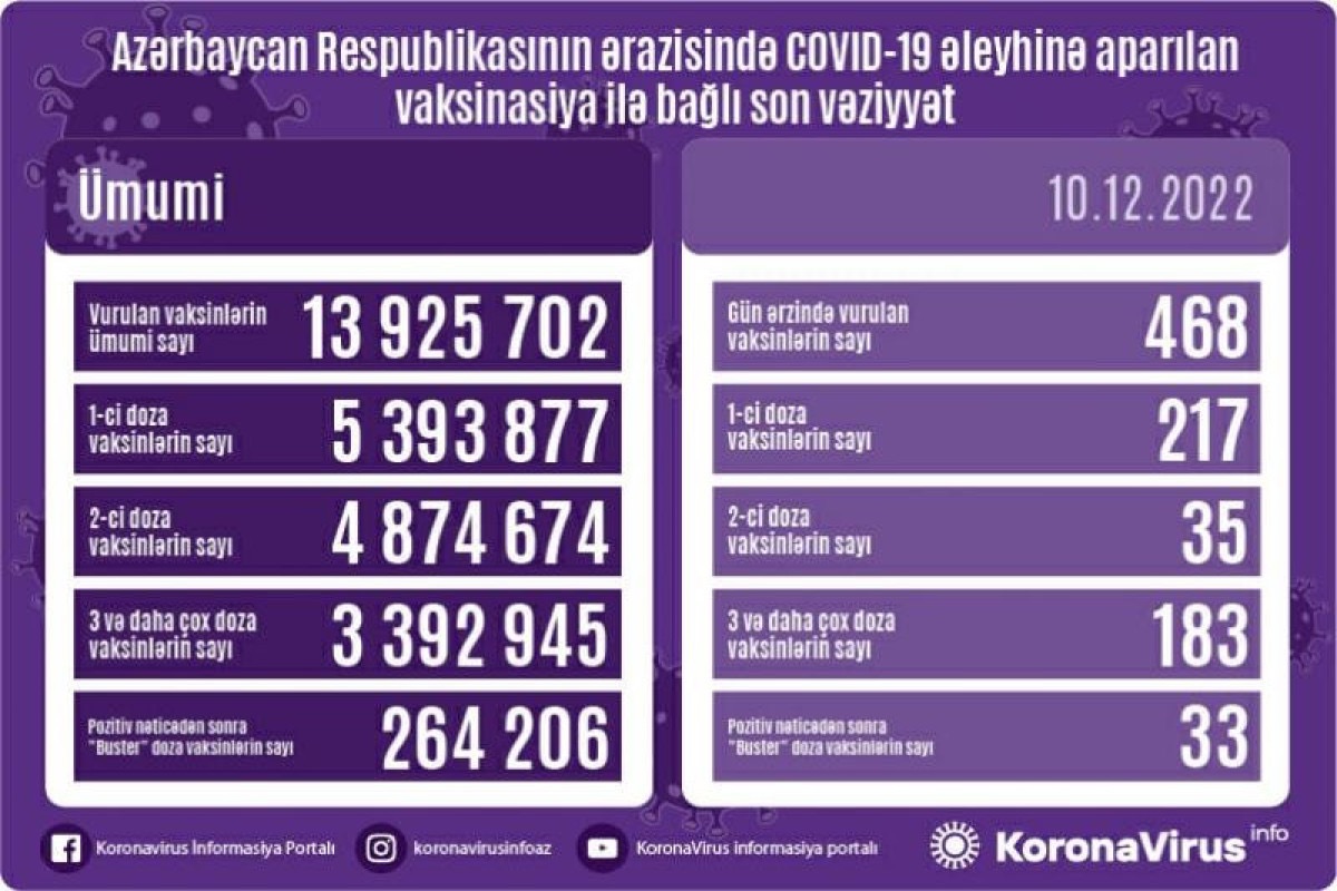 Azərbaycanda son sutkada koronavirus (COVID-19) əleyhinə 468 vaksin vurulub.
