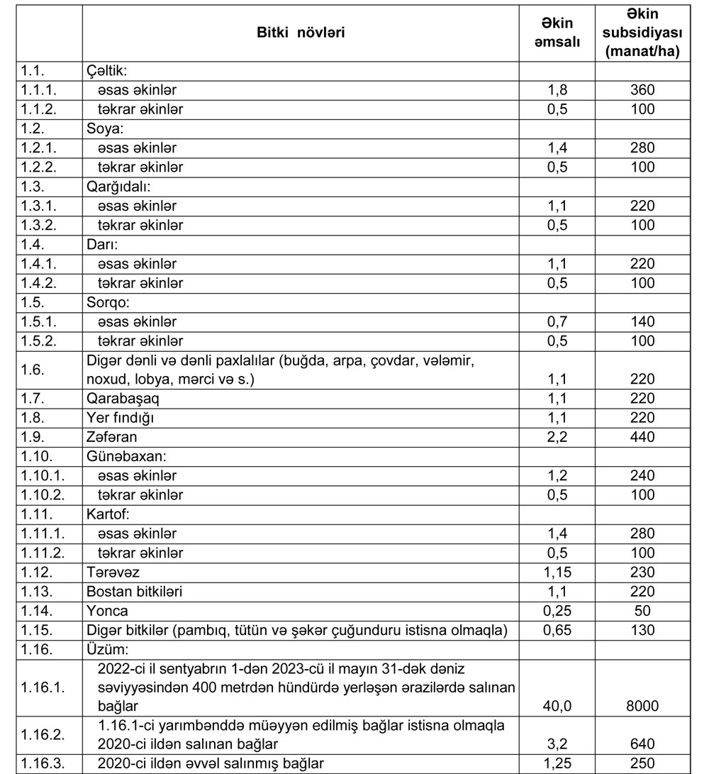 Qərara əsasən, baza məbləği 200 manat olmaqla 2023-cü ildə əkin əmsalları və əkin subsidiyasının məbləği kənd təsərrüfatı bitkiləri üzrə aşağıdakı kimi müəyyən olunub: