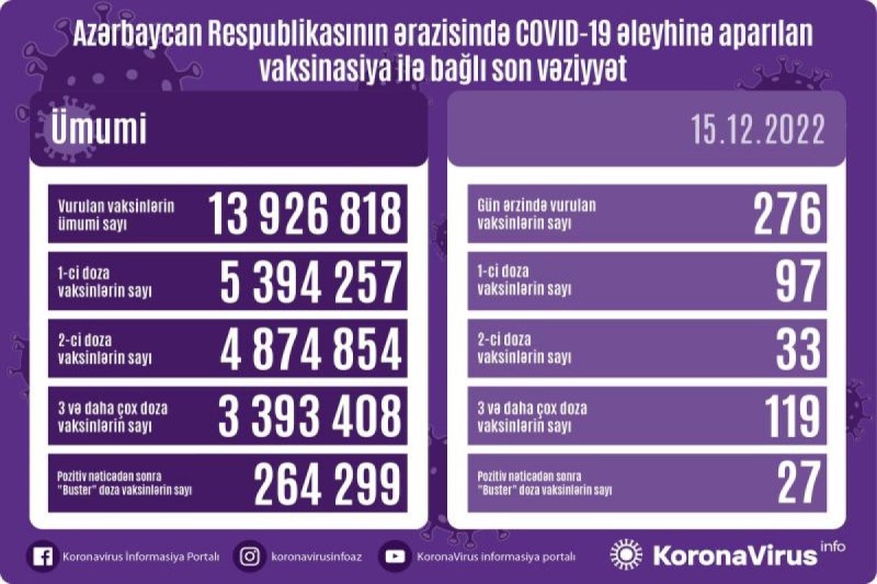 Azərbaycanda son sutkada koronavirus (COVID-19) əleyhinə 276 vaksin vurulub. Bir gündə birinci mərhələ üzrə vaksinasiya olunanların sayı 97, ikinci mərhələ üzrə vaksinasiya olunanların sayı 33, üç və daha çox doza üzrə vaksinasiya olunanların sayı 119, pozitiv nəticədən sonra buster doza üzrə vaksinasiya olunanların sayı 27 nəfərdir.