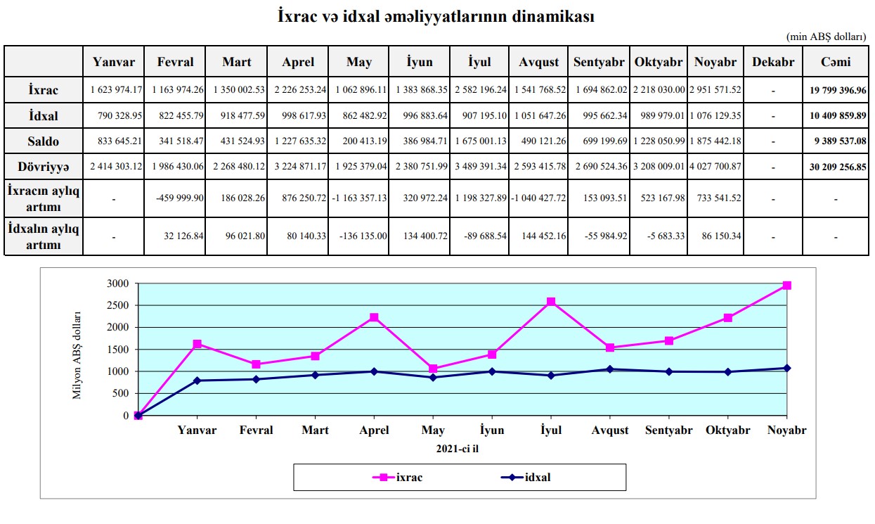 Xatırladaq ki, 2021-ci ilin 11 ayında Azərbaycanın xarici ticarət əməliyyatlarının həcmi 30 milyard 209 milyon 257 min ABŞ dolları, o cümlədən, ixrac əməliyyatları 19 milyard 799 milyon 397 min ABŞ dolları, idxal əməliyyatları 10 milyard 409 milyon 860 min ABŞ dolları, saldo 9 milyard 389 milyon 537 min ABŞ dolları təşkil etmişdi.