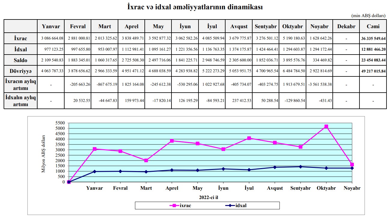 2022-ci ilin 11 ayında (yanvar-noyabr) Azərbaycanın xarici ticarət əməliyyatlarının həcmi 49 milyard 217 milyon 15 min ABŞ dolları, o cümlədən, ixrac əməliyyatları 36 milyard 335 milyon 560 min ABŞ dolları, idxal əməliyyatları 12 milyard 881milyon 466 min ABŞ dolları, saldo 23 milyard 454 milyon 83 min ABŞ dolları təşkil edib.