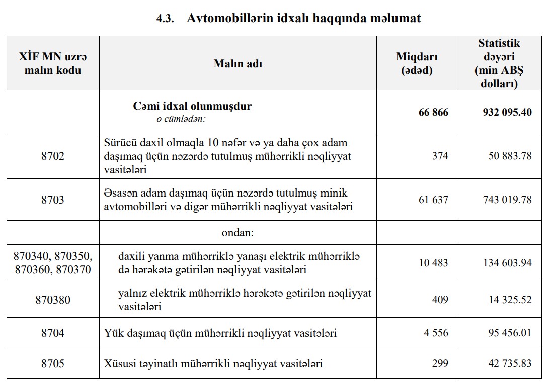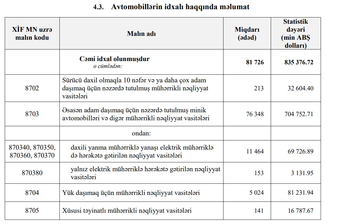Xatırladaq ki, 2022-ci ilin 11 ayında Azərbaycana 835 milyon 377 min dollar dəyərində 81 min 726 ədəd avtomobil idxal edilmişdi.