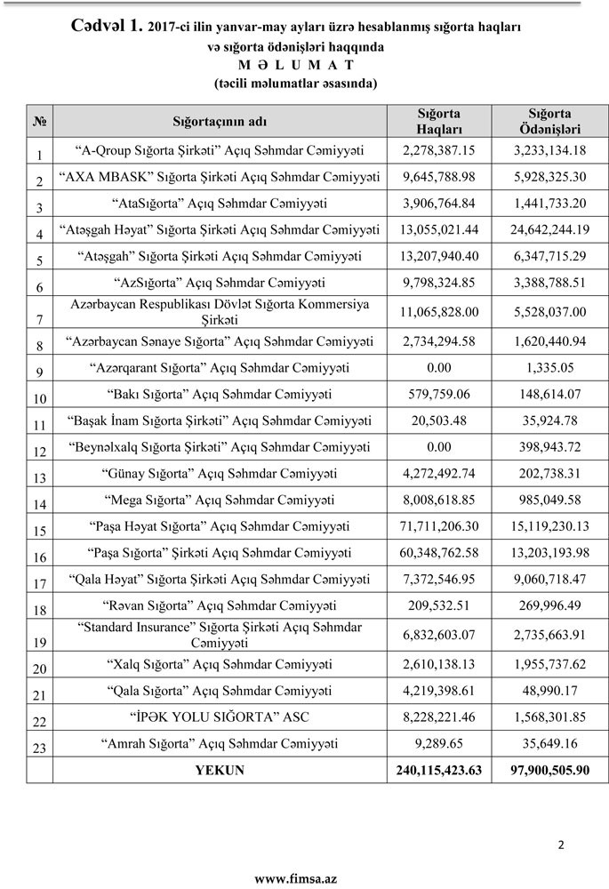 Maliyyə Bazarlarına Nəzarət Palatası 2017-ci ilin yanvar-may ayları üzrə hesablanmış sığorta haqları və sığorta ödənişləri haqqında məlumatları açıqlayıb.
