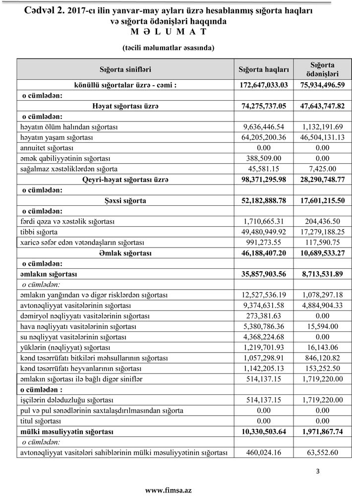 İlk baxışda sığorta bazarında vəziyyətin elə də pis olmadığı görünür. Əslində sığorta bazarında kəskin geriləmə həyat sığortasının hesabına baş verməyib. Belə ki, 2017-ci ilin yanvar-may ayları üzrə hesablanmış 240 milyon 115 min manat sığorta haqlarının 92 milyon 138 min manatı həyat sığortasının, 147 milyon 976 min manatı qeyri-həyat sığortasının payına düşüb. 2016-cı ilin eyni dövründə bu bölgü 69 milyon 350 min manat (həyat) və 172 milyon 788 min manat (qeyri-həyat) idi. Qısası, qeyri-həyat sığortası bazarı 172 milyon 788 min manatdan 147 milyon 976 min manata geriləyib (14,4% azalıb).