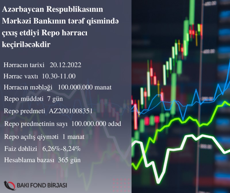 20 dekabr 2022-ci il tarixində Bakı Fond Birjasında Azərbaycan Respublikasının Mərkəzi Bankının tərəf qismində çıxış etdiyi Repo hərracı keçiriləcəkdir.