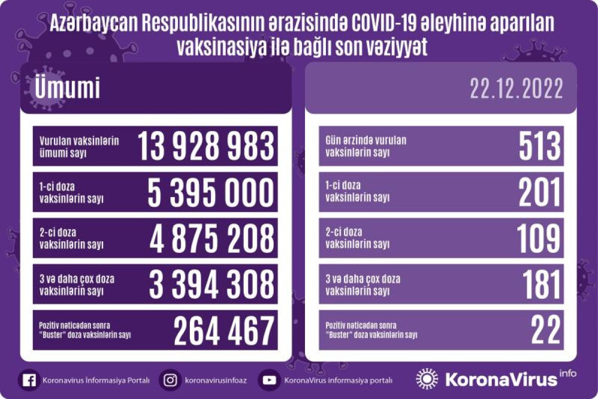 Azərbaycanda son sutkada koronavirus (COVID-19) əleyhinə 513 vaksin vurulub. Bir gündə birinci mərhələ üzrə vaksinasiya olunanların sayı 201, ikinci mərhələ üzrə vaksinasiya olunanların sayı 109, üç və daha çox doza üzrə vaksinasiya olunanların sayı 181, pozitiv nəticədən sonra buster doza üzrə vaksinasiya olunanların sayı 22 nəfərdir.