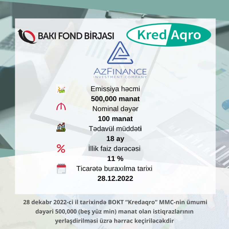 Birjanın yaydığı məlumata görə, 28 dekabr 2022-ci il tarixində BOKT "Kredaqro" MMC-nin ümumi dəyəri 500 min manat olan istiqrazları yerləşdirilməsi birqiymətli hərrac üsulu ilə Bakı Fond Birjasında həyata keçiriləcəkdir.