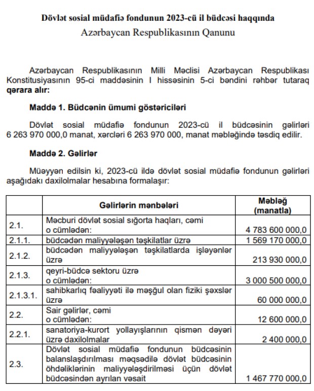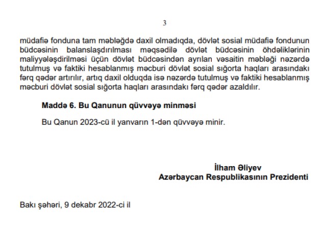 Prezident İlham Əliyev "Dövlət sosial müdafiə fondunun (DSMF) 2023-cü il büdcəsi haqqında Azərbaycan Respublikasının Qanunu"nu imzalayıb.