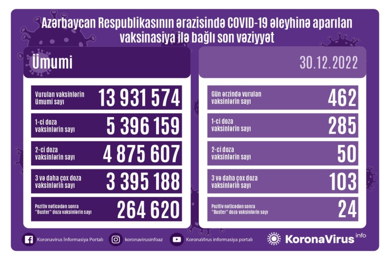 Azərbaycanda son sutkada koronavirus (COVID-19) əleyhinə 462 vaksin vurulub. Bir gündə birinci mərhələ üzrə vaksinasiya olunanların sayı 285, ikinci mərhələ üzrə vaksinasiya olunanların sayı 50, üç və daha çox doza üzrə vaksinasiya olunanların sayı 103, pozitiv nəticədən sonra buster doza üzrə vaksinasiya olunanların sayı 24 nəfərdir.**