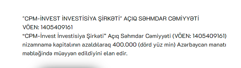“CPM-İnvest İnvestisiya Şirkəti” Açıq Səhmdar Cəmiyyəti nizamnamə kapitalının azaldılaraq 400 000 Azərbaycan manatı məbləğində müəyyən edildiyini elan edir",- Şirkətin məlumatında deyilir.