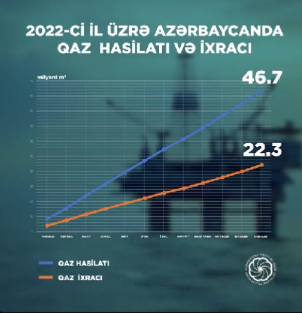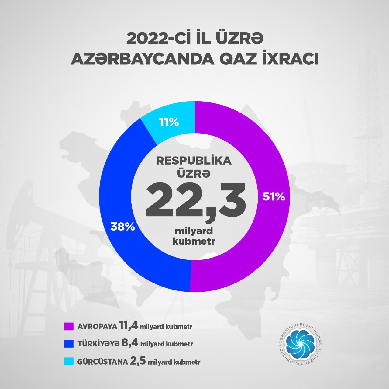 Azərbaycanın qaz ixracı 2021-ci illə müqayisədə 2022-ci ildə 18% artıb. Ötən il 6,5% artımla hasil edilmiş 46,7 mlrd.m3 qazın 22,3 mlrd.m3-i (və ya 47,7%-i) ixrac olunub.