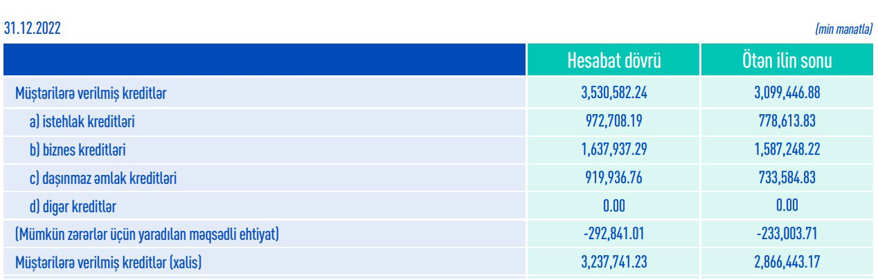 Aktivlərinin həcmi başda olmaqla bir sıra göstəricilər üzrə Azərbaycanın ən böyük bankı olan "ABB" ASC-nin (Azərbaycan Beynəlxalq Bank) 2022-ci ildə kredit portfeli (müştərilərə verilmiş kreditlər) 431 milyon 135 min manat artaraq 31 Dekabr 2022-ci il tarixində 3 milyard 530 milyon 582 min manata çatıb. Bank 2021-ci ilin sonunda 3 milyard 99 milyon 447 min manat cəmi kredit portfelinə malik idi.