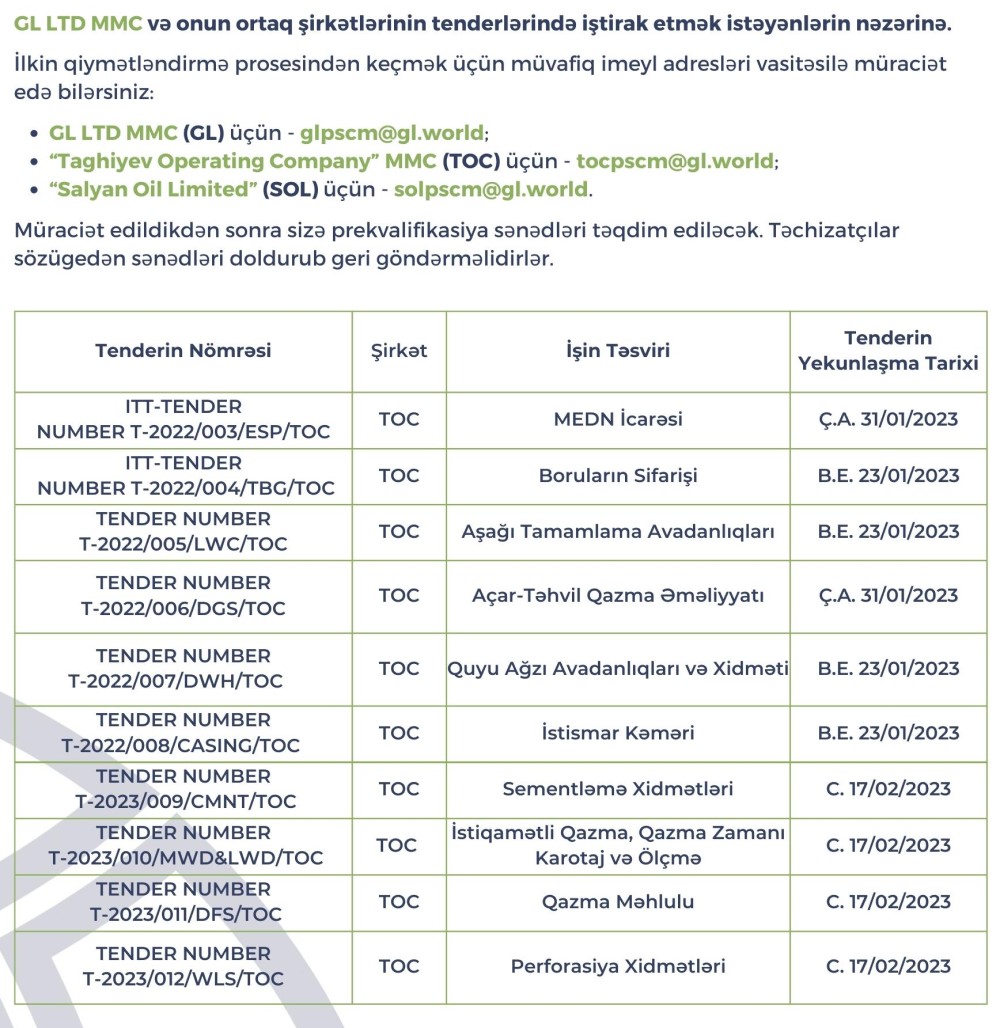 GL və onun ortaq şirkətlərinin tenderlərində iştirak etmək istəyirsinizsə, müraciət qaydası ilə bağlı məlumatlara nəzər salın.