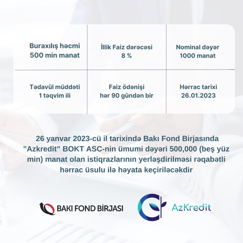 23 yanvar 2023-cü il tarixində Bakı Fond Birjasının (BFB) Listinq Komitəsinin qərarı ilə ”Azkredit” BOKT ASC-nin ümumi dəyəri 500 yüz min manat olan istiqrazları standart bazar seqmentində listinqə daxil edilib.