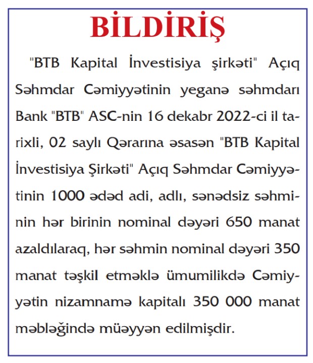 "BTB Kapital İnvestisiya Şirkəti" ASC-nin nizamnamə kapitalı 650 min manat azaldılaraq 1 milyon manatdan 350 min manata endirilib.