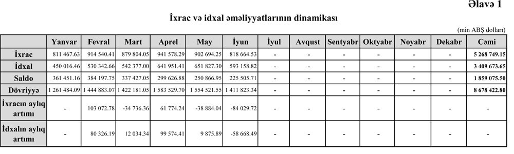 İyunda ixrac 818 milyon 664.53 dollar, idxal 593 milyon 158.82 dollar, saldo isə 225 milyon 505.71 dollar olub. Mayda ixrac 902 milyon 694 min dollar, idxal isə 651 milyon 827.3 min dollar, saldo 250 milyon 866 min dollar olmuşdu. Beləliklə, İyunda idxal və ixrac May ayı ilə müqayisədə azalıb.
