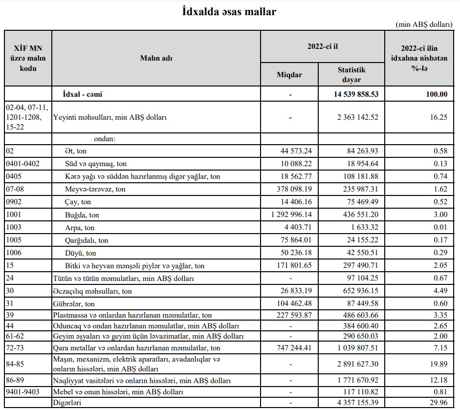 2022-ci ildə (yanvar-dekabr) Azərbaycanın ən çox ixrac və idxal etdiyi mallar.