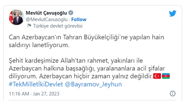 Türkiyənin xarici işlər naziri Mevlüt Çavuşoğlu Tvitter səhifəsində yazıb:
