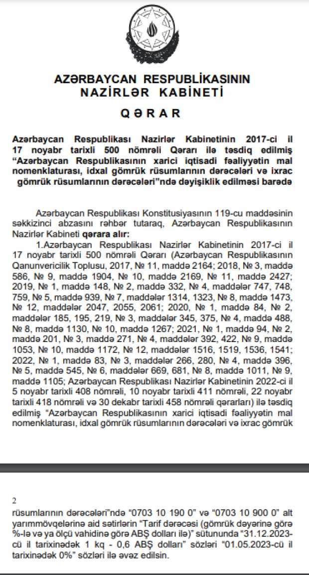 Bununla bağlı Baş nazir Əli Əsədov “Azərbaycan Respublikasının xarici iqtisadi fəaliyyətin mal nomenklaturası, idxal gömrük rüsumlarının dərəcələri və ixrac gömrük rüsumlarının dərəcələri”nə dəyişiklik edilməsi ilə bağlı qərar imzalayıb.