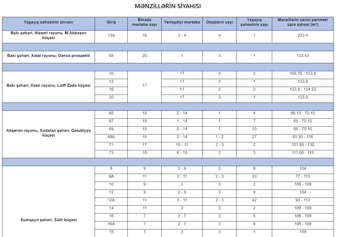 Mənzillərin siyahısı ilə aşağıdan və ya bu keçid vasitəsilə tanış ola bilərsiniz.