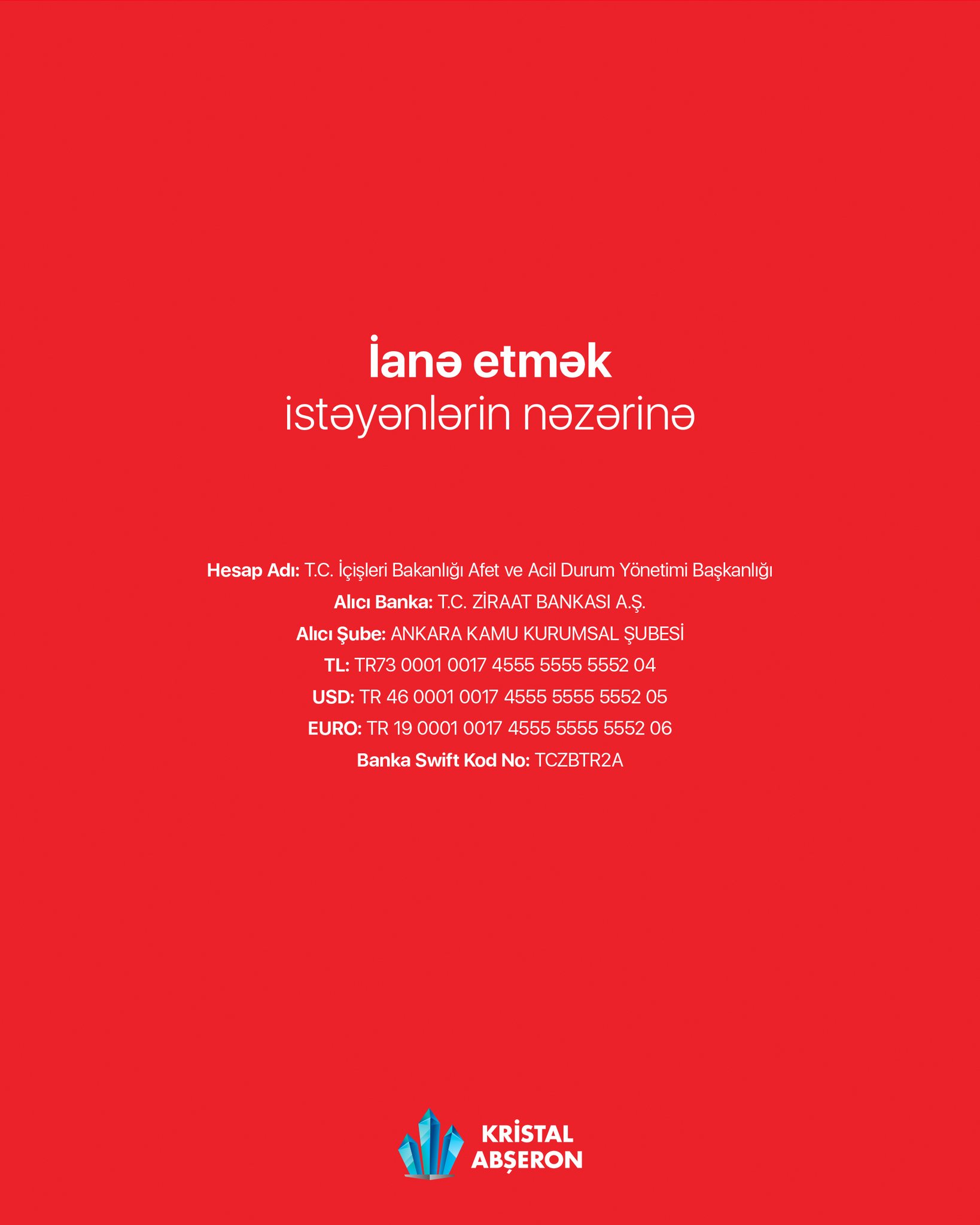Davam edən axtarış və xilasetmə əməliyyatlarına Kristal Abşeron olaraq öz dəstəyimizi göstərmək adına T.C. İçişleri Bakanlığı Afet ve Acil Durum Yönetimi Başkanlığı - AFAD-a 600 000 TL ianə etdik və 650 000 TL dəyərində isə Türkiyədən qida məhsulları, Azərbaycandan isə bir sıra zəruri ləvazimatlar (çadır, yataq dəstləri və çarpayı, masa, oturacaq, qızdırıcı və s.) alaraq zəlzələ bölgəsinə göndəririk.