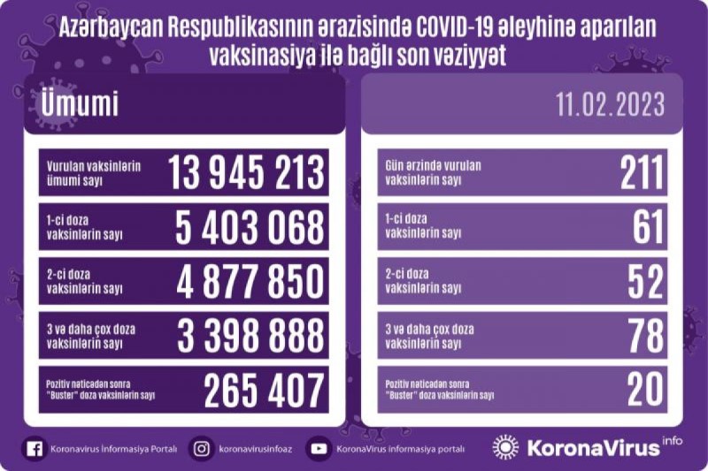 Azərbaycanda son sutkada koronavirus (COVID-19) əleyhinə 211 vaksin vurulub. Bir gündə birinci mərhələ üzrə vaksinasiya olunanların sayı 61, ikinci mərhələ üzrə vaksinasiya olunanların sayı 52, üç və daha çox doza üzrə vaksinasiya olunanların sayı 78, pozitiv nəticədən sonra buster doza üzrə vaksinasiya olunanların sayı 20 nəfərdir.