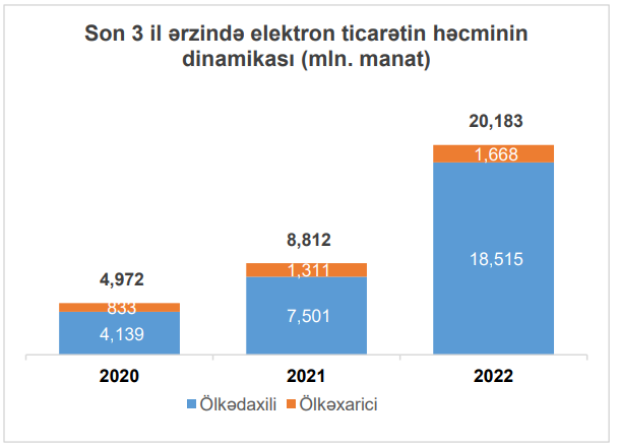 Qeyd edilib ki. ölkədə ödəniş kartları ilə aparılan nağdsız ödənişlərin böyük hissəsi elektron ticarət əməliyyatlarının payına düşmüşdür. 2022-ci il ərzində elektron ticarət əməliyyatlarının sayı 2021-ci il ilə müqayisədə 2.4 dəfə artaraq 261 mln. ədəd, həcmi isə 2.5 dəfə artaraq 18.5 mlrd. manat olmuşdur.