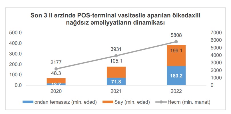 Təsərrüfat subyektlərində 2022-ci il ərzində POS-terminal vasitəsilə aparılan nağdsız əməliyyatların sayı 2021-ci il ilə müqayisədə 89.4% artaraq 199 mln. ədəd, həcmi isə 47.7% artaraq 5.8 mlrd. manat olmuşdur. O cümlədən, 2022-ci il ərzində POS-terminallarla aparılan təmassız ödənişlərin sayı 2021-ci il ilə müqayisədə 2.6 dəfə artaraq 183.2 mln. ədəd, həcmi isə 2 dəfə artaraq 4.9 mlrd. manat olmuşdur.