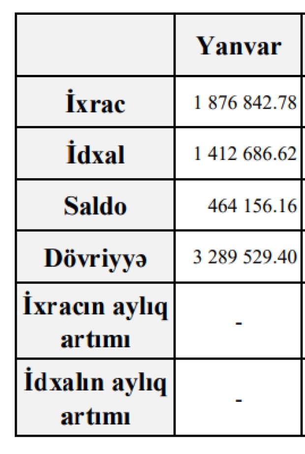 Xatırladaq ki, 2022-ci ilin yanvar ayında Azərbaycanın xarici ticarət əməliyyatlarının həcmi 4 milyard 61 milyoyn 547 min ABŞ dolları, o cümlədən ixrac əməliyyatları 3 milyard 86 milyon 682 min ABŞ dolları, idxal əməliyyatları 974 milyon 865 min ABŞ dolları, saldo 2 milyard 111 milyon 817 min ABŞ dolları təşkil etmişdi.