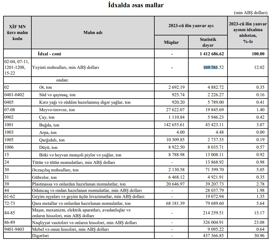 2023-cü ilin yanvar ayında Azərbaycana 169 milyon 761 min dollar dəyərində yeyinti məhsulları idxal edilib.