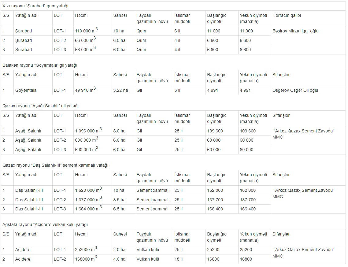Faydalı qazıntı yataqlarının istifadəyə verilməsi ilə bağlı keçirilən 15 fevral hərracında Xızıda yerləşən “Şurabad” qum yatağının 22 ha sahəsi, Balakəndə “Göyəmtala” gil yatağının 3,22 ha, Qazaxda “Aşağı Salahlı” gil yatağının və “Daş Salahlı-III” sement xammalı yatağının müvafiq olaraq 20 ha və 25 ha, Ağstafada “Acıdərə” vulkan külü yatağının 6 ha sahəsi istifadəyə verilib.
